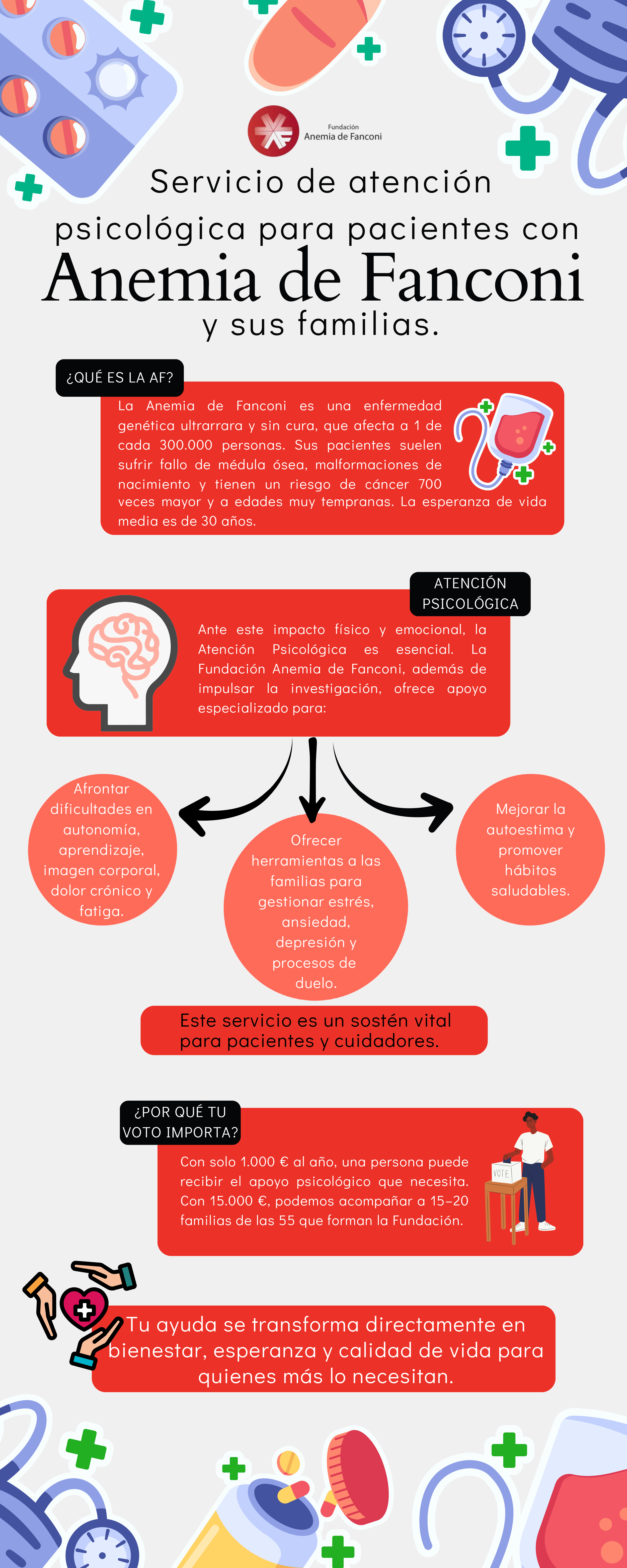 Dado el impacto físico y emocional significativo (incluyendo dificultades en autonomía, dolor crónico, fatiga y en la imagen corporal), la Fundación Anemia de Fanconi (FAF) impulsa un Servicio de Atención Psicológica para pacientes y sus familias. Este servicio es un sostén vital para pacientes y cuidadores.