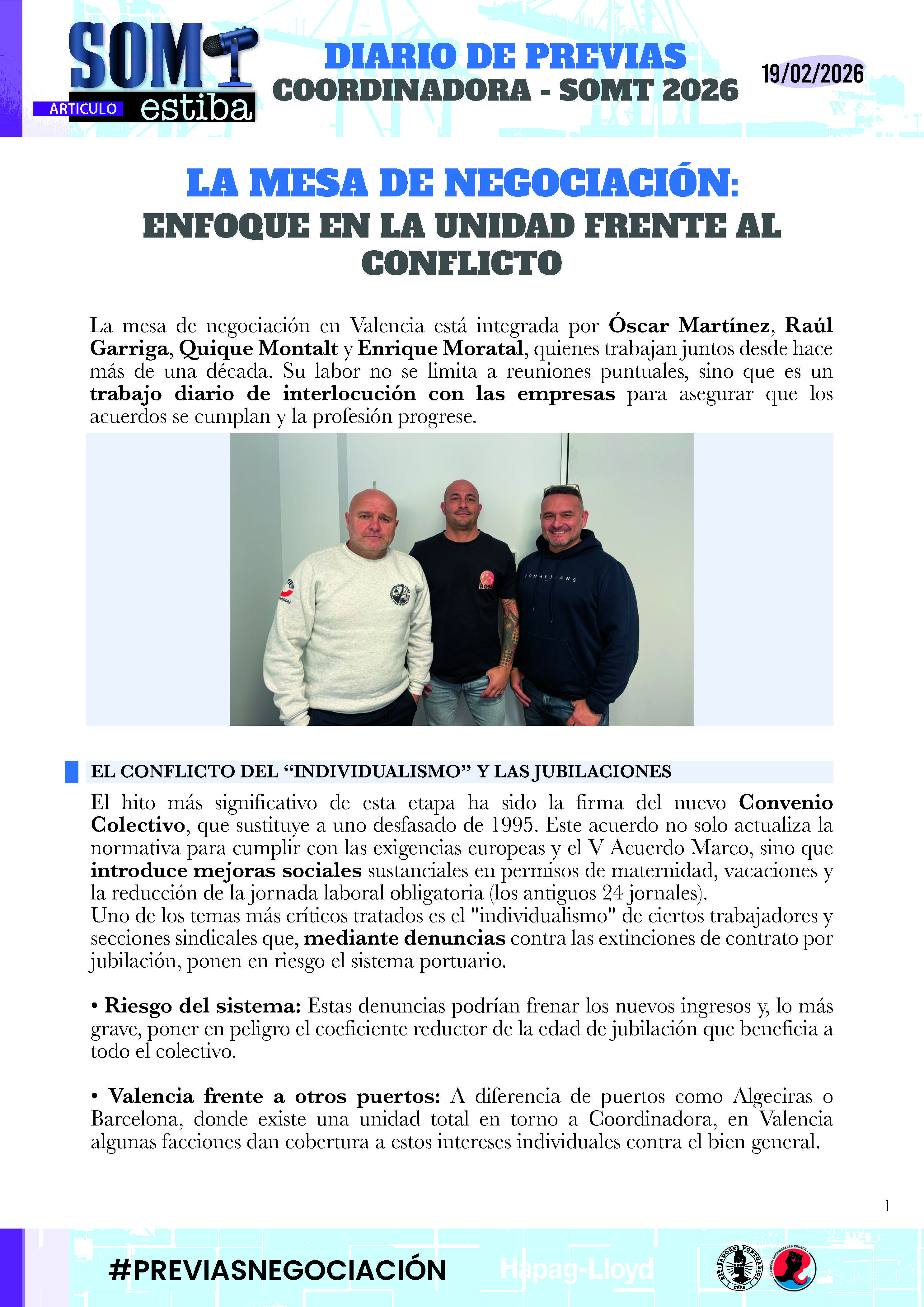 La mesa de negociación en el puerto de Valencia representa mucho más que un espacio de diálogo: es el eje donde se construye el presente y el futuro de la estiba. Formada por un equipo con amplia experiencia, su trabajo diario con las empresas garantiza el cumplimiento de los acuerdos y la evolución de la profesión en un entorno cada vez más exigente.